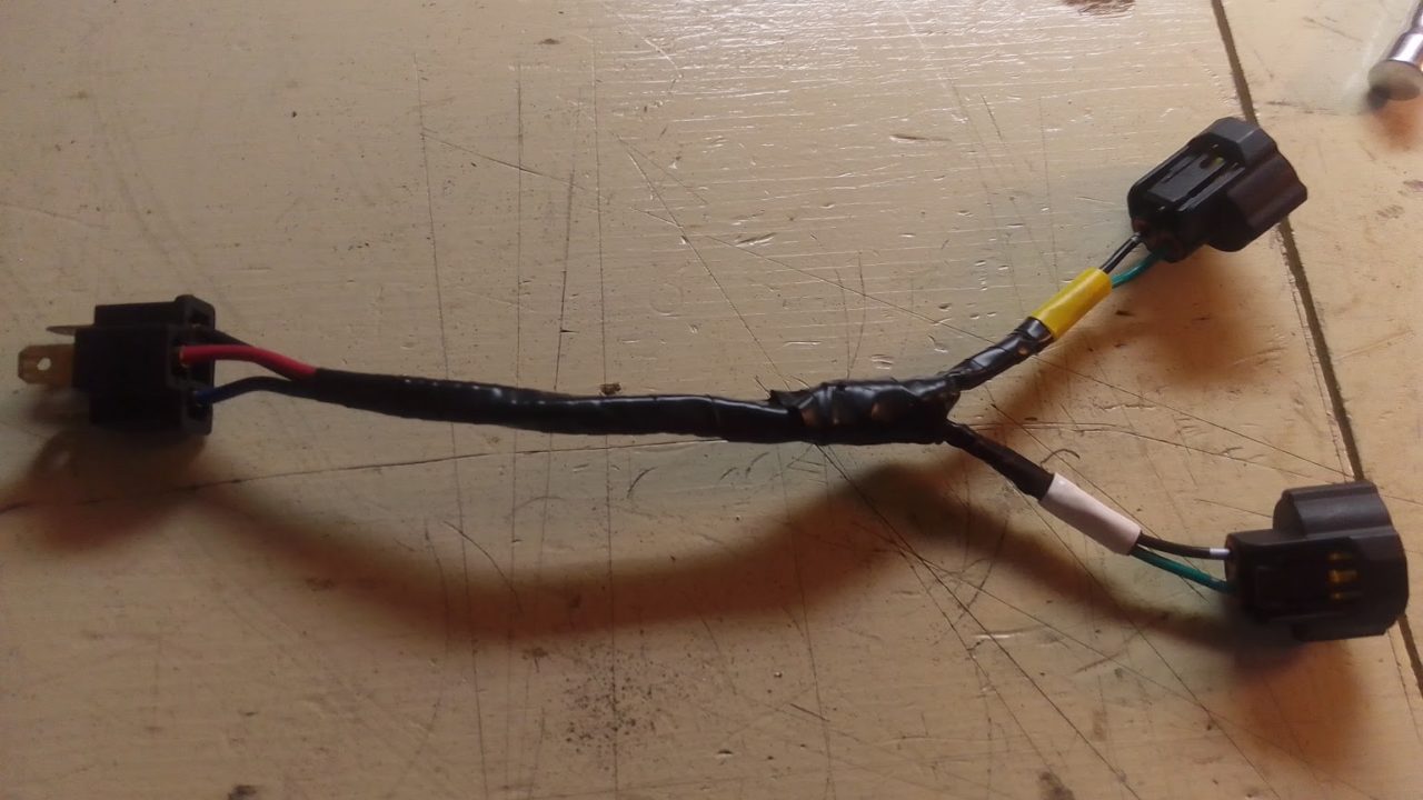Since I wanted to be able to go back to the factory headlight assemblies I decided to make a small harness to go from the factory H4 connection to the two H9 connections.